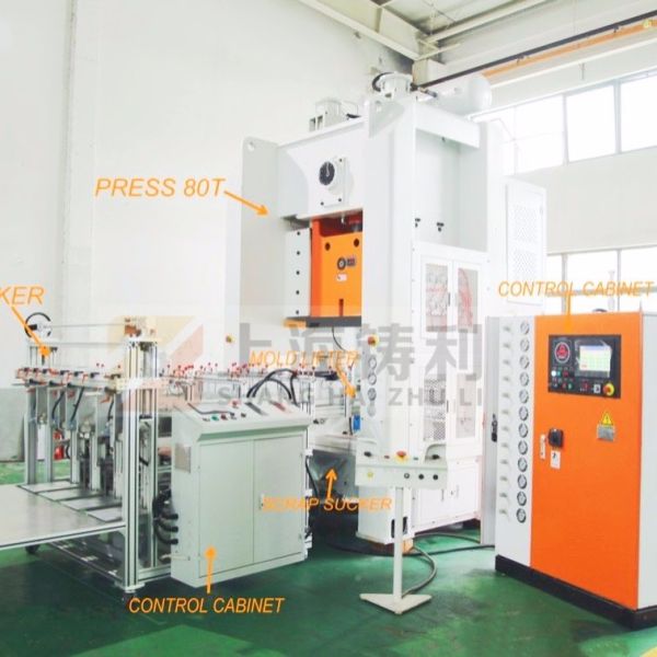 Decoiler+Press T80/T130+Mold Shifting arms with Lifter +Scrap Aspirator+Control Cabinet+ Stacker+ Scrap Baler.
